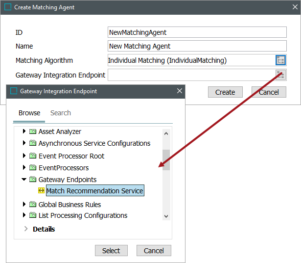 2. Configure the gateway integration endpoint for the matching agent. For more information, refer to the Configuring the Match Recommendation Service Gateway topic.