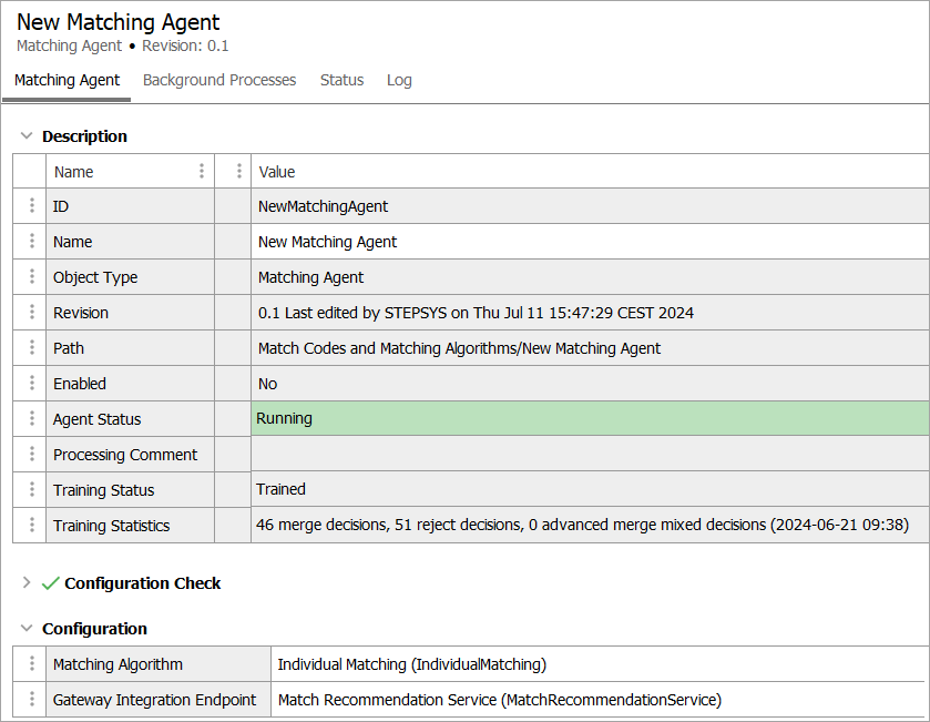 • Enabled - Displays whether the matching agent is enabled or not. The matching agent collects clerical review decisions as long as it is enabled, regardless of what the Agent Status is.