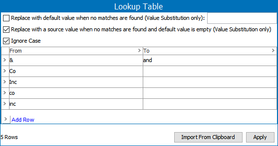 Apply the selected Replacement String Lookup Table - which case-insensitively replaces every substring occurrence of a 'From' entry in the Replacement String Lookup Table with the 'To' entry. Replacement is performed in the order of the table. This allows removal of characters, accents, quotations, or apostrophes. It can also be used to Romanize non-Latin characters.