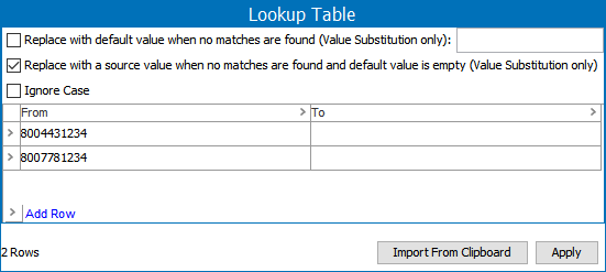 Replacement Lookup Table - This lookup table should remove invalid phone number values, like main phone numbers for close business partners that are often shared between hundreds of contact persons. When the normalizer runs, it replaces occurrences of a 'From' entry with the 'To' entry sequentially from the first row to the last row. Refer to the topic Transformation Lookup Tables in the Resource Materials online help documentation.