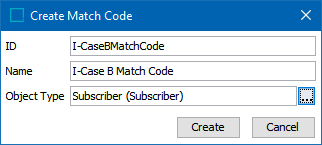 In the Create Match Code dialog, add an ID a Name, an Object Type, and click Create. Additional object types can be identified in the Match Code editor after creation.