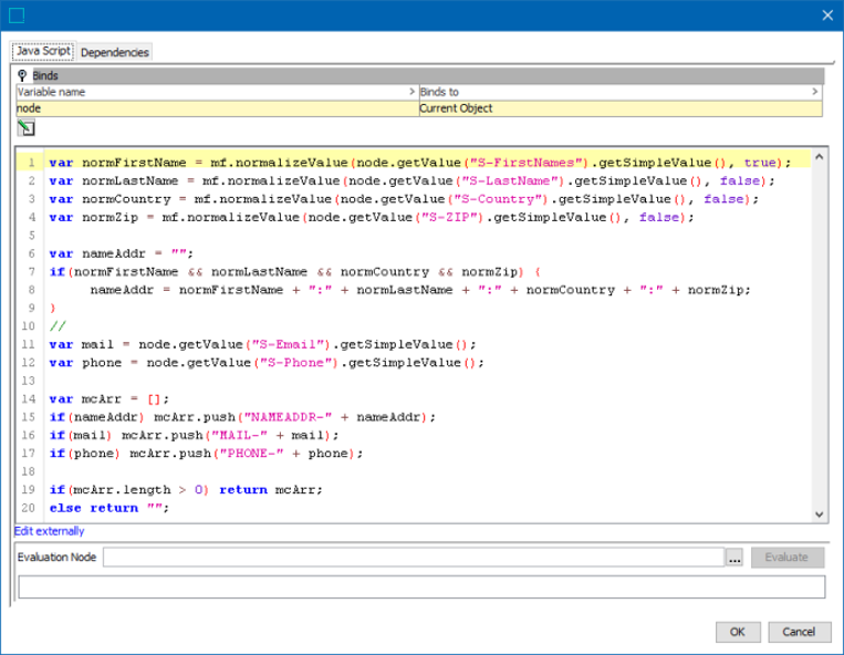 JavaScript - Bind the current object to a variable. The goal should be to return the match code value of an object from the JavaScript. If a string is returned, it is used as a match code value. If a JavaScript array is returned, all values in the array are used as match code values for that object. Additional utility functions for match codes can be accessed by binding Matching Functions to the context variable in JavaScript, for example, or by binding 'Lookup Table Home' to 'lth.' For more information, refer to the topic Text Functions in the Resource Materials online help documentation.