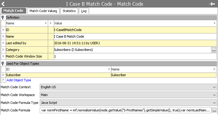 In the Match Code Formula Type parameter, specify JavaScript or Calculated as the format. This selection determines the dialog display by the Match Code Formula parameter.