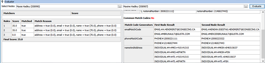 The matching algorithm evaluator tool verifies results and can help identify unexpected results. In the evaluator, select two objects that you want to compare and click the Evaluate button. Detailed information is displayed including how the result was obtained. Additionally, the evaluators on individual sub components of the algorithm can be used to expose more details.