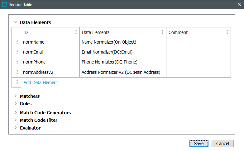 The Data Elements flipper of a decision table defines the initial input data for the match criteria. The output of a data element is used by the selected Matchers (as defined in the topic Match Criteria Matchers). The data elements required are determined by the kind of data being matched, for example, the following image shows data elements for matching on individuals.