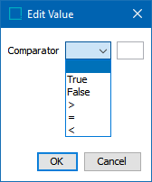 ) to access the 'Edit Value' dialog and select a comparator from the dropdown. If the condition threshold is defined in the matcher, select 'True', otherwise, manually enter the condition threshold.