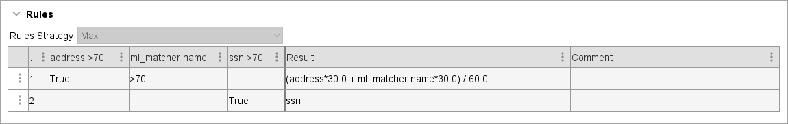 The rules strategy determines which rule provides the final score based on the rule expression displayed in the Result column.