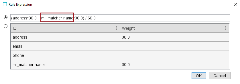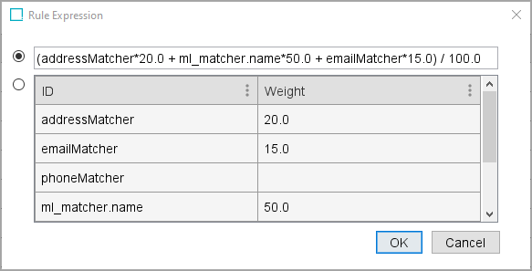 ) to access the Rule Expression dialog. On the 'Rule Expression' dialog, click the radio button to manually define an expression or use the table to add the desired weights for the relevant conditions and generate the relevant expression. Click OK.