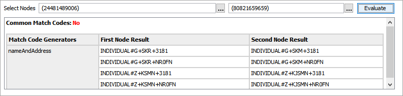 The Common Match Codes parameter displays 'Yes' when the same match code is generated for the selected nodes. When 'No' is displayed, either one or both nodes have no value, or when the generated match codes are not the same.