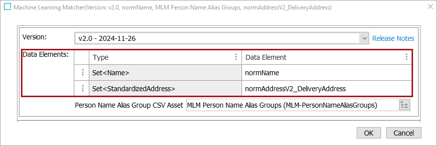 • In Data Elements, a table is available with the ‘Type’ and ‘Data Element’ fields. The ‘Type’ field is pre-populated with the supported types for the version selected. To specify the data elements from which the Machine Learning Matcher should obtain input, click into the ‘Data Element’ field and make a selection.