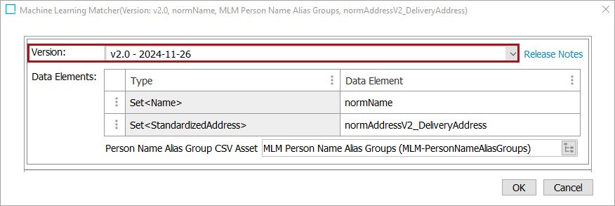 The Machine Learning Matcher has a version concept that allows versioning of the matcher. New versions are released outside of the normal STEP update cycle. In the Machine Learning Matcher configuration dialog, there is a link to open 'Release Notes' that explain the changes done in each version.