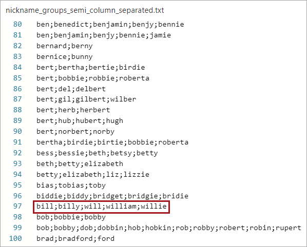 All names on each row of the file are considered part of a nickname group, and all names are handled equally, meaning that the order of the names has no significance.
