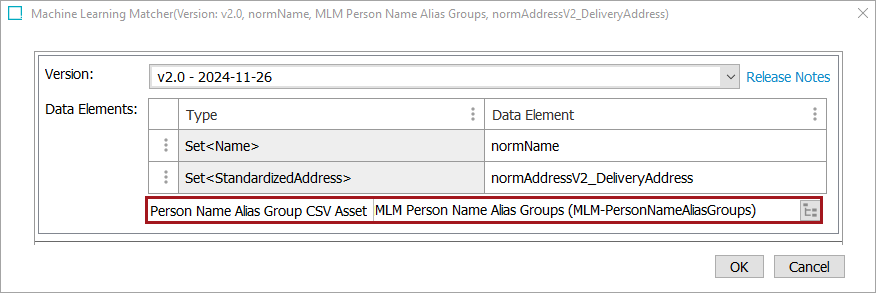 • Versions that support person name matching often also support nickname groups. To provide a Person Name Alias Group CSV Asset containing nickname alias groups, click the ellipsis button () and browse to select the file. Before supplying the CSV asset, a new 'Person Name Alias Group CSV - Asset Object Type' must be configured in the Matching Component Model. For more information, refer to the Configuring Matching Component Model topic in the Matching, Linking, and Merging documentation.