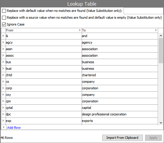 A Word Alias Table can be used to perform case-insensitive matching by alias. The Customer & Supplier MDM Configuration Guide in the Solution Enablement documentation refers to a Word Alias Table (illustrated below) that allows the matching to handle common organization word substitutions like 'co' with 'company'. For more information, refer to the topic Transformation Lookup Tables in the Resource Materials online help documentation.