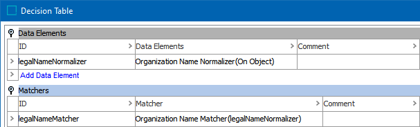 The Organization Name Matcher takes input from the selected Input Normalizer. This is usually an Organization Name Data Element. The matcher retrieves all organization names for the two objects under comparison.