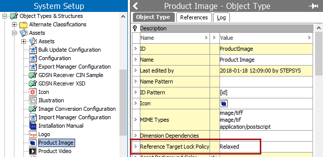 For example, the image below shows the 'Reference Target Lock Policy' is set to 'Relaxed' for object type 'Product Image (ProductImage)' since the many of the optimistic locking errors in the asset push apply to this object type.