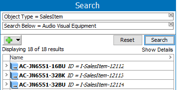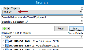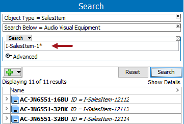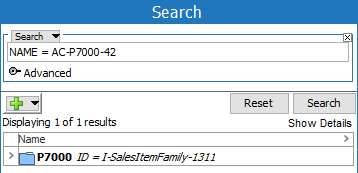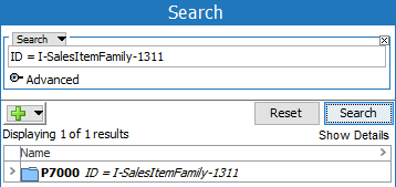 Search using 'ID = value' to search for objects by looking in the ID parameter only. For example, search for the 'I-SalesItemFamily-1311' value only in the ID field.