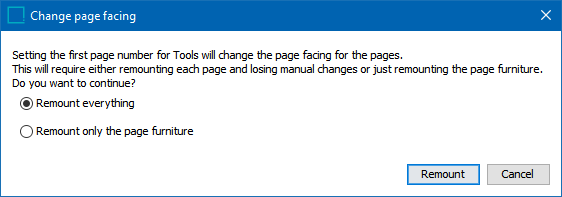 - When page numbers are changed, it may result in page swap from left to right or right to left. If this is the case, the Change page facing dialog is displayed. Select either 'Remount everything' or 'Remount only the page furniture,' then click Remount.
