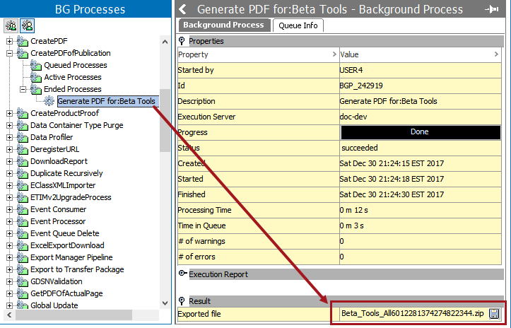 - The process occurs and the resulting file is delivered under the 'CreatePDFofPublication' node on the BG Processes tab. If Make Single PDF was selected, a PDF file is delivered. If Make Single PDF was not selected, a .ZIP file containing multiple PDFs is delivered.