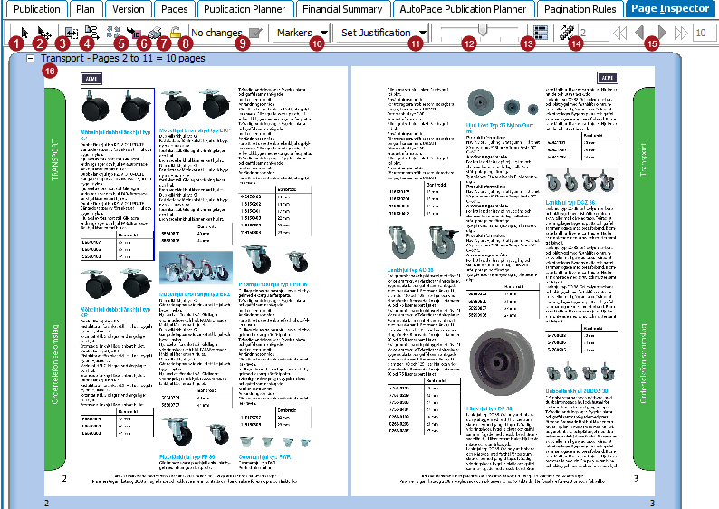 The following screenshot shows an example of an autopaginated catalog spread as viewed in the Page Inspector. The toolbar at the top of the Page Inspector contains the tools that can be used on the mounted objects and pages. The numbers in the following screenshot correspond with the numbered entries in the table directly below it.