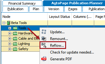 - If using the AutoPage Publication Planner, select the relevant sections or objects, right-click, then choose Reflow.