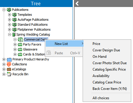- Expand the publication, then right-click the Commercial Data folder and select New List. A list of eight commercial terms object types displays. Price is the most commonly used commercial list object type.