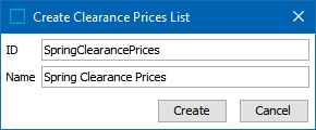 - In the Create List dialog, enter an ID and Name for the commercial list, then click Create. In the below example, the name of the commercial list type ('Clearance Prices') displays in the dialog label ('Create Clearance Prices List').