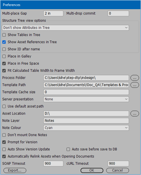 - Process Folder: This is the path in the directory structure in which Print Publisher stores information. This folder may contain a number of items: inSTEPLogOptions.xml to control logging and sub-folders for logs (default destination for logging), tmp (where any temporary files are stored), comms (where communications trace information is stored for diagnostic), and scripts (JavaScript event handler[s], when applicable). The system will use the default path (C:\Users\[User_Name]\step-dtp\indesign\) if not set by the user.