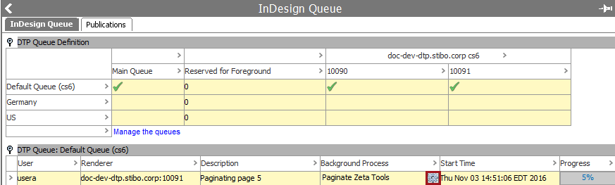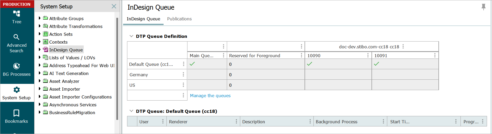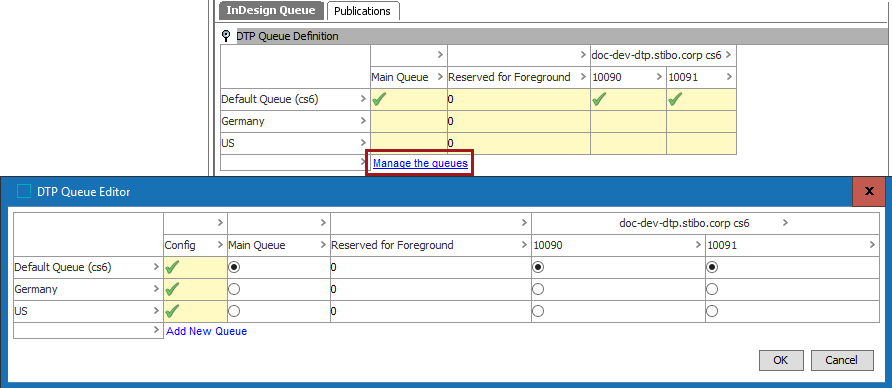 - On the InDesign Queue tab, expand DTP Queue Definition, then click 'Manage the queues' to display the DTP Queue Editor.