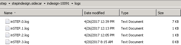 Each time a job is sent to an InDesign renderer, log files are generated and stored on the InDesign server in a 'logs' folder for that renderer. The below screenshot shows a standard 'logs' location on a Windows-based InDesign server (for example, E:\step\stepindesign.sidecar\indesign-10091\logs). However, you do not need to log in to the IDS to view and/or download these logs, as they are easily accessed from the IDS Logging tab in the Admin Portal. For more information, refer to the IDS Logging topic in the Administration Portal documentation.