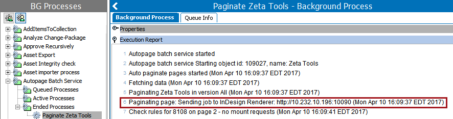 Background processes for jobs sent to the InDesign server appear in the Autopage Batch Service queues on the BGProcesses tab. The Execution Report for these processes displays the IP address of the InDesign server and the port number of the renderer that is processing the job.