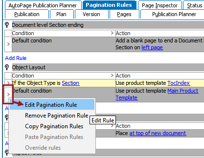 - To delete a condition or action from a pagination rule on the Pagination Rules tab, right-click on the small arrow in the row that contains the rule that the condition or action is applied to, then choose Edit Pagination Rule.