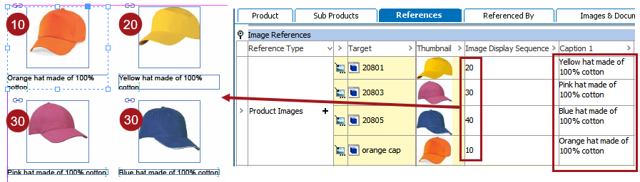 - After the View Definition is configured, the Image Display Sequence attribute will be visible on the References tab of your product on the link between the product object and the assets. The below screenshot shows seven images linked to the product using the Product Images reference type and a column containing the Image Display Sequence attribute.