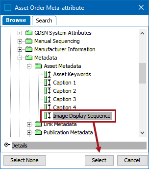 - In the Asset Order Meta-attribute dialog that displays, browse to or search for the asset ordering attribute, then click Select.