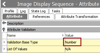 - The following screenshot shows an attribute with a STEP ID of ImageDisplaySequence and a name of Image Display Sequence. It is recommended to give the attribute an easily identifiable ID and name so it will not be confused with other sequencing attributes, such as an attribute display sequence attribute. The same attribute cannot be used for both image display and attribute display.The attribute must have a Type of Description and a Validation Base Type of Number.