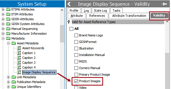 - On the Validity tab for the attribute, make the attribute valid on the asset reference types that you will be using it for. In this example, the Image Display Attribute is valid on the Product Images reference type.