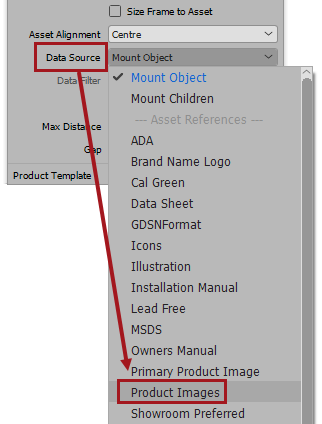 - Next, click on the Data Source dropdown list and select the desired asset reference type, for example, Product Images.
