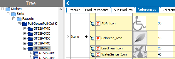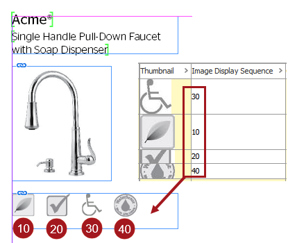 Typically, image sequencing for multiple images in a single frame is used for small icons that need to be sequenced in a certain order. This example uses a kitchen sink product that appears on the page along with icons indicating that the faucet meets the following compliance standards: ADA, Cal Green, NSF Lead-Free, and EPA WaterSense. An asset reference type named Icons is used.