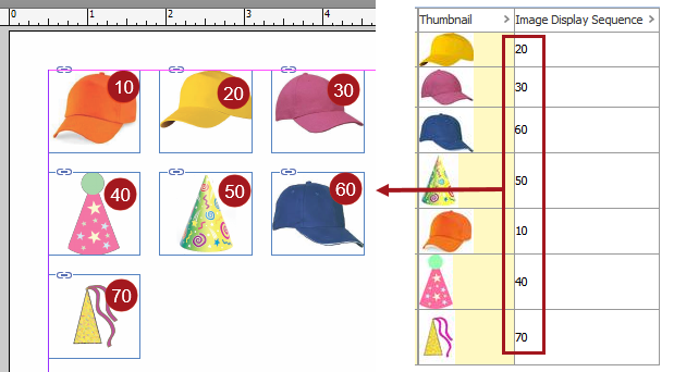 In Print Publisher, assets can be mounted in a specified sequence on InDesign pages by using an Asset Order Meta-attribute that is valid on the link between products and image reference types. This attribute is used for asset reference types that allow for multiple references.
