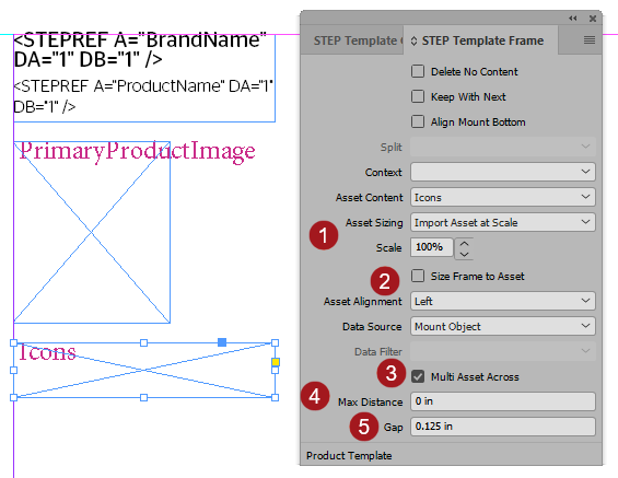 - (1) The selections chosen for Asset Sizing and Max Scale are up to the user. In this example, the settings ensure that the assets will be imported at actual size (100%). Recommended practice when using small images such as icons is to load them into STEP at the actual size they will appear on the page. However, if they are not actual size, they can be scaled to be either smaller or larger by changing the Scale value. (This will apply equally to all images in the frame.) For more information on asset sizing parameters, refer to the Image Frame Parameters topic.