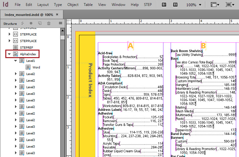 Because Print Publisher enables documents to be saved back to STEP with page numbers, publication indexes can be created by using the STEP Export Manager to export the index words in an XML file. The file can then be imported into InDesign to create an index, as pictured in the below screenshot. For more information, refer to the Creating Document Indexes topic.