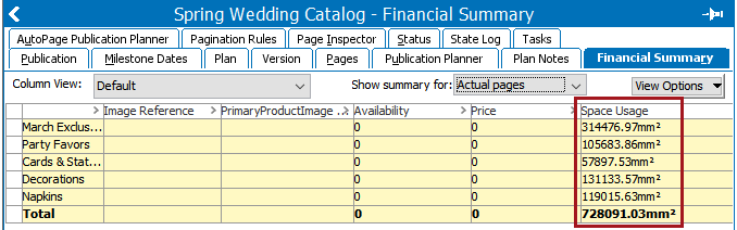 Space usage for mounted objects in Flatplanner publications can be viewed on the Financial Summary tab for publication and section objects and within the Financial Report Excel sheet that can be pulled from a publication or section.