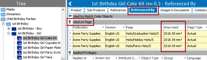 The Referenced By tab contains space usage information about objects mounted on InDesign pages, from an object perspective. Space usage data for mounted objects is located under the Used on Page flipper. This flipper is available for product, classification, asset, and entity objects. In the below example, the '1st Birthday Girl Cake Kit' product is shown to be mounted on three different InDesign pages stored in STEP. The space usage data is available in the Area Used column.