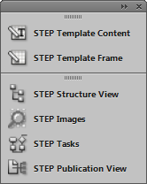 The STEP Panels are used for actual mounting of STEP data, including template composition and image mounting. Six InDesign panels (also referred to as panels in various locations throughout this guide) are used with Print Publisher: