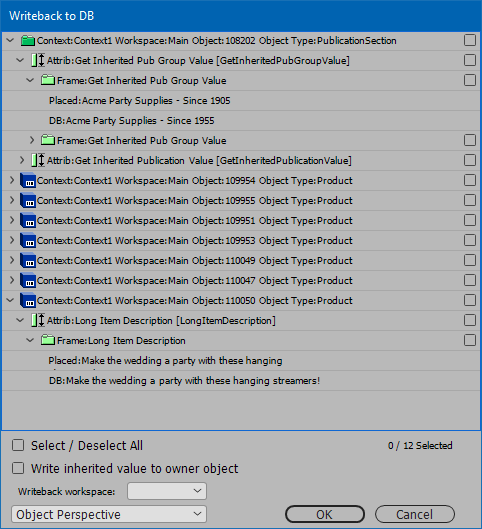 - Writing a value back to an owner (parent / grandparent) object that exists in the Approved workspace will cause this object to become unapproved. Users should take care to ensure that data writeback from InDesign does not impact other processes (such as Outbound Integration Endpoints) that rely exclusively on products in the Approved workspace.