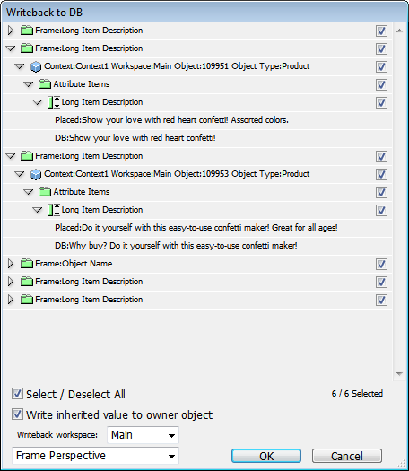 - Writeback to DB: A general writeback option involving a dialog box that shows all items on the document that can be written back. Users can choose which items should be written back.