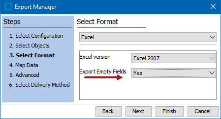 When exporting via Excel, CSV, STEPXML, or Advanced STEPXML, users have the option to include empty fields in the exported data.