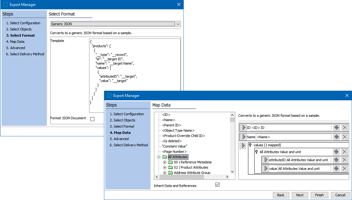 A new Generic JSON export format plugin has been added to outbound integration endpoints (OIEPs) and Export Manager. JSON is a widely used format for data exchange. This new functionality significantly simplifies the work for STEP administrators and enterprise architects as they can now send data in JSON format without requiring scripting, extensions, or other complex configurations.