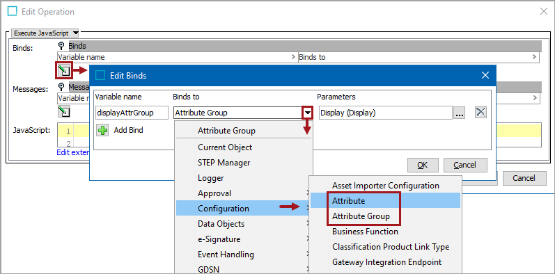 In this example, the Variable Name is 'displayAttrGroup', the Binds to field is Attribute Group, and the Parameters field shows the Display attribute. The following JavaScript returns the ID of the Display attribute group as an Info log message: