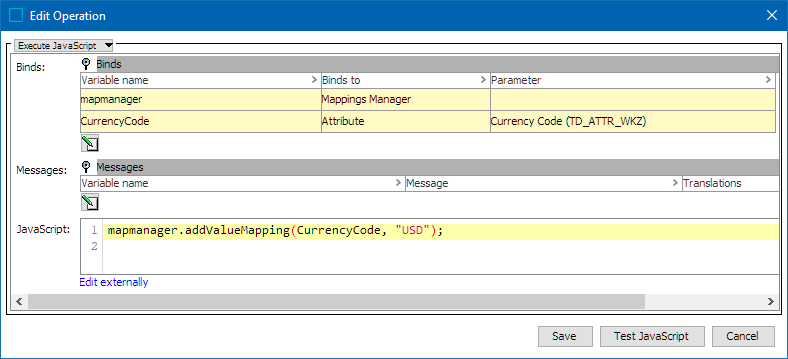 The Mappings Manager is bound in as the 'mapmanager' variable, and adds the value 'USD' to the Attribute 'TD_ATTR_WKZ' through the 'CurrencyCode' variable.